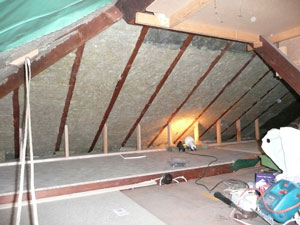 The original loft insulation is chopped paper, but this could not be installed down into the eaves, so the edge of the house was uninsulated. The new insulation batts were installed right down to the wall plates. Loose insulation was fitted in the perimeter voids. A lightweight timber frame was built between the deck and rafters.