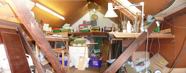 The loft workshop - note the purlin props, hardbopard lining, back-to-back work benches and rooflight. Oh, and just a little bit of clutter! A bit more storage space would be handy.