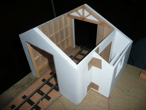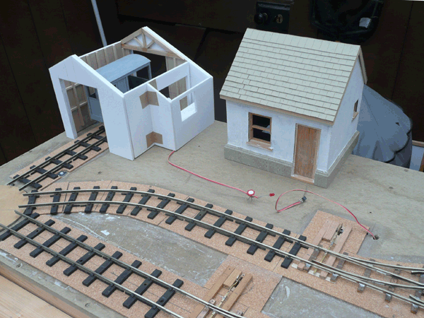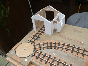 As the track was being laid, I realised that the section of track to the wagon works/engine shed could be extended to the back of the layout, to connect into the fiddle yard. The area suddenly took on more relevance and a building came into being. Made (as usual) of polyboard, but with timber and ply added.