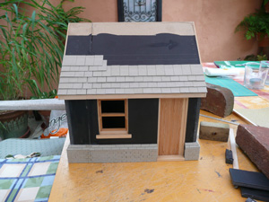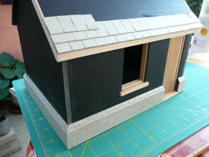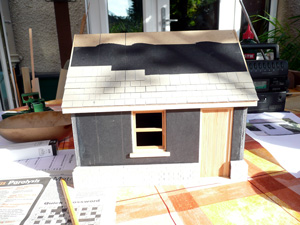 I'd added the plinth, cut and glued on the 600+ bricks added the fascia boards and started gluing on the 400+ slates when that nagging doubt came to a head. In planning out the inside of the office/store/wc I'd made it wider than the photo version and it just wasn't right. I took a razor saw to it and reduced its length by 2 feet. I then realised that the roof overhang changed its apparent height, so I added a foot to its height too! |