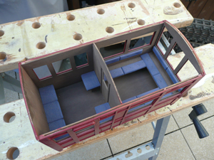 The smaller coach had most potential. It was a stretched version of my standard coach, but fitted out as an observation saloon. Its layout leant itself to an outer lobby for coats, tools, boots, a sink, & mugs etc, and an inner office with a desk, filing cabinet and a couple of chairs. I liked the idea. The plush seating would have to go, but it's in a good cause and it's an interesting exercise, even if don't use it in the end. |