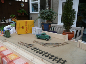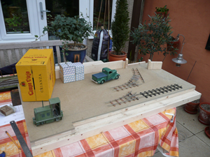I just couldn't resist a mock-up of the layout just to check that what was in my mind actually worked. A few boxes, some wood, a couple of plants (approx the correct height), some track and stock. Yep, looks ok to me. |