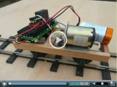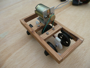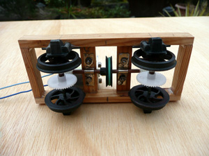 Once the controls and trackwork really came together, I just had to get a loco. I'd been struggling on a 'serious' model, but something 'quick' was needed. Various boxes and bags were rumaged providing a motor from a cd player(?), Binnie nylon coach wheels, some worm gears, the proverbial rubber band and this appeared ...