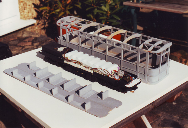 The chassis was a Lima 'O' gauge class 33 diesel extended in the middle. A drop-down section under the middle contained the switching and sockets for charging the bank of rechargable batteries that laid under the seating. The roof supports are a throw back to model aircraft wings. Just visible in the framework is a reed switch for the speed controller. This unit came with a simple on-off switch and when activated, the loco speed slowly built up then down when switched off. The switch was replaced by the reed switch located under the luggage rack. A large suitcase with a magnet embedded could be dropped on the rack to strart it moving.